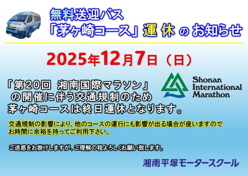 送迎バス「茅ヶ崎コース」運休のお知らせ